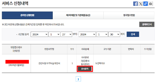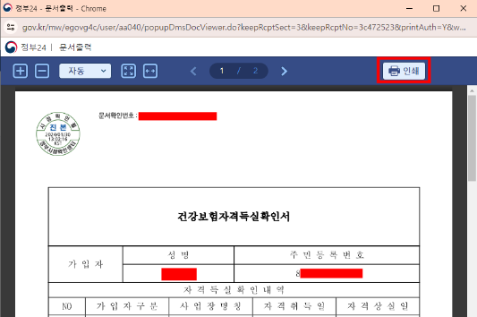 건강보험자격득실확인서 신청이 완료되고 문서출력 버튼을 누르셔서 출력하시면 됩니다.