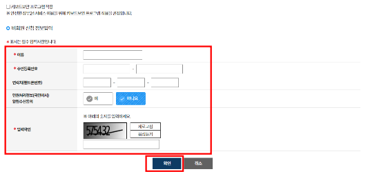비회원 신청 정보 입력 후 확인 버튼 누릅니다.