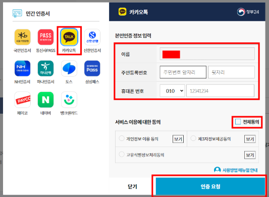 카카오톡 본인인증 정보입력하신 후 전체동의버튼 체크 후 인증요청합니다.