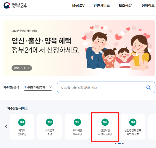 건강보험자격득실확인서 발급을 위해서는 정부 24 홈페이지에 접속합니다.