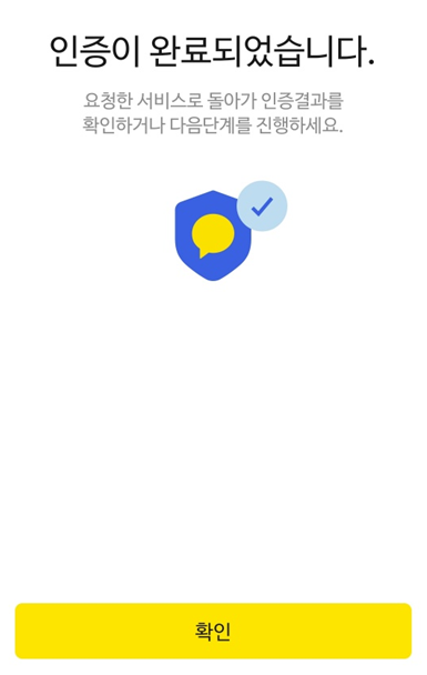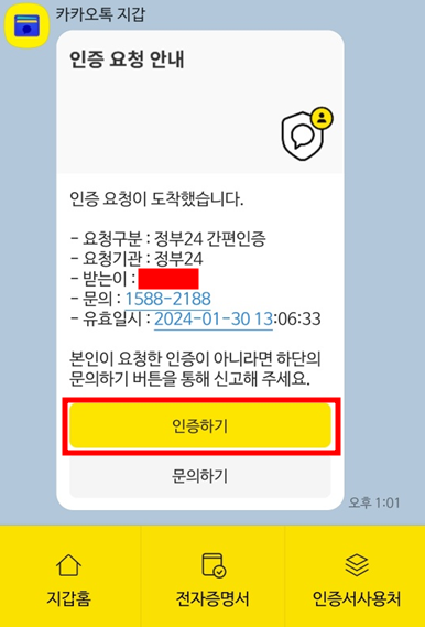 핸드폰 카카오톡으로 인증 요청 안내를 받으시고