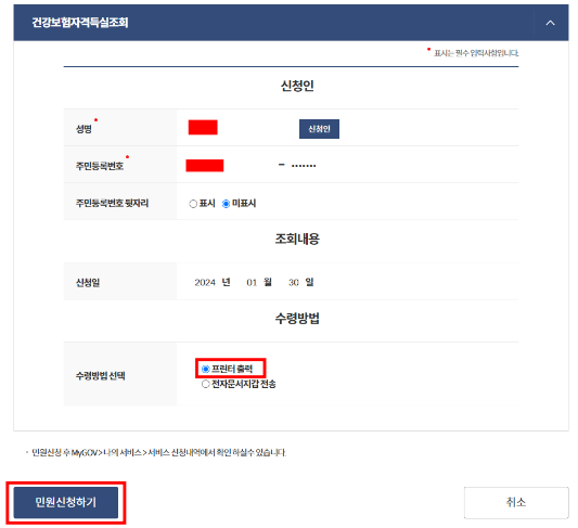 건강보험자격득실조회 화면이 나오면 신청인 내용을 확인하신 후 주민등록번호 뒷자리 표시, 미표시 체크 하신 후 수령방법 선택 프린터 출력, 전자문서지갑 전송 체크 후 민원신청하기 버튼을 클릭합니다.