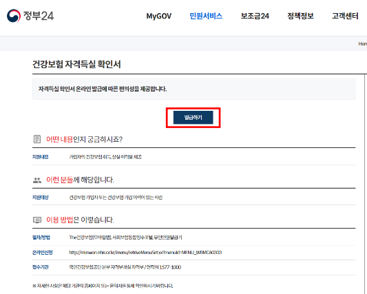 건강보험자격득실확인서 "발급하기" 버튼 클릭합니다.