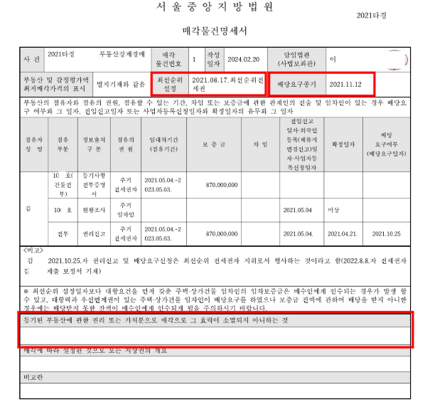 매각물건명세서에는 최선순위설정일자와 배당요구종기, 등기된 부동산에 관한 권리 또는 가처분으로 매각으로 그 효력이 소멸되지 아니하는 것에 관한 내용등 중요한 내용이 담겨있습니다.