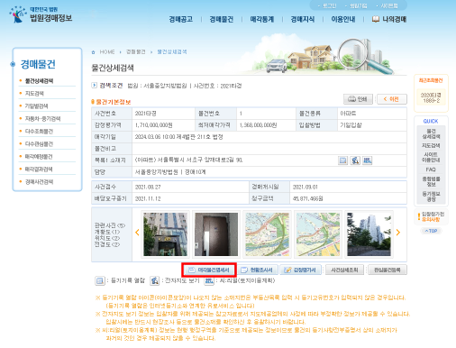 대법원경매 홈페이지에 들어가면 경매물건-물건상세검색으로 물건 검색하고 해당물건기본정보에 매각물건명세서가 매각기일 2주 전에 보입니다.
