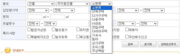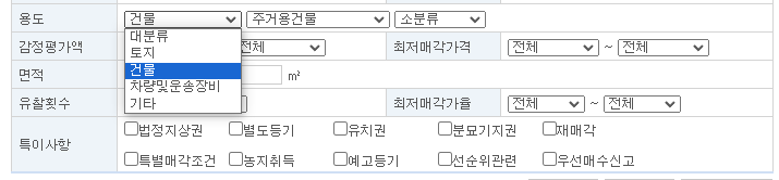 관심 있는 물건의 소재지를 입력하신 후 용도에 대분류, 중분류, 소분류가 나뉘어 있습니다.