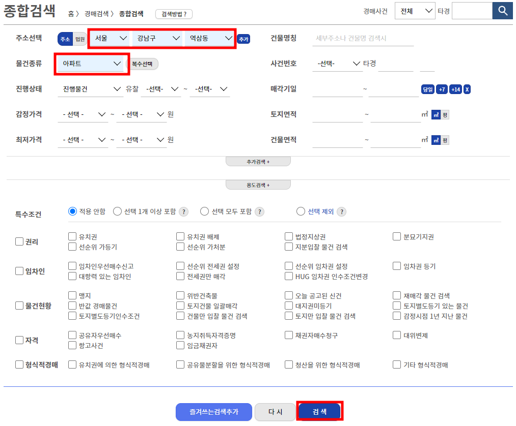 2. 상단 메뉴에 경매 검색 → 종합검색 → 물건종류 선택 → 소재지 동까지 선택하면 자동으로 물건이 보입니다.