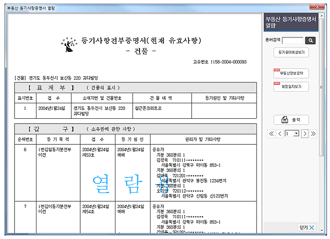 열람 화면에서 출력하신 열람용 등기사항증명서는 법적 효력이 없습니다.