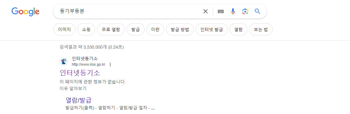 먼저 구글이나 네이버 검색창에 "등기부등본" 이라고 검색합니다.