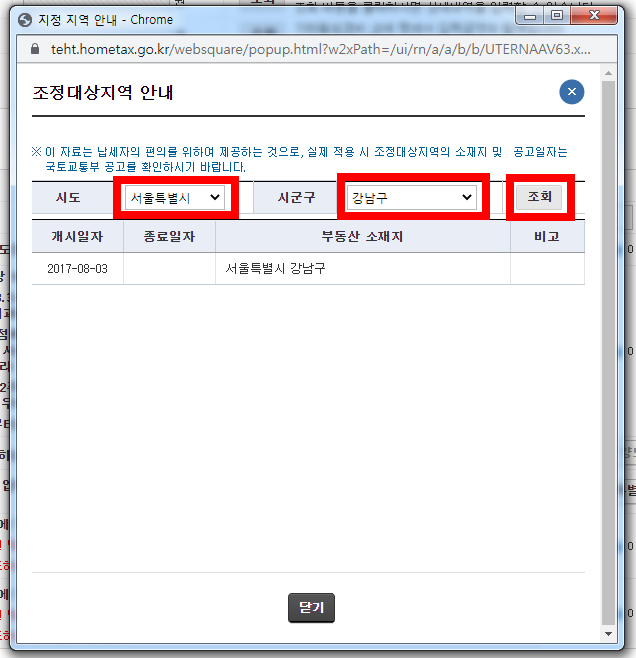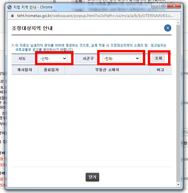 조정대상지역 안내 팝업창에 궁금하신 지역의 해당 주소 시도와 시군구를 입력한 후 조회 버튼을 누르시면
