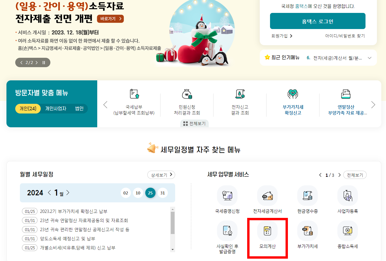 화면 중간으로 스크롤을 내리시면 "세무 업무별 서비스"에 "모의계산"을 클릭합니다.
