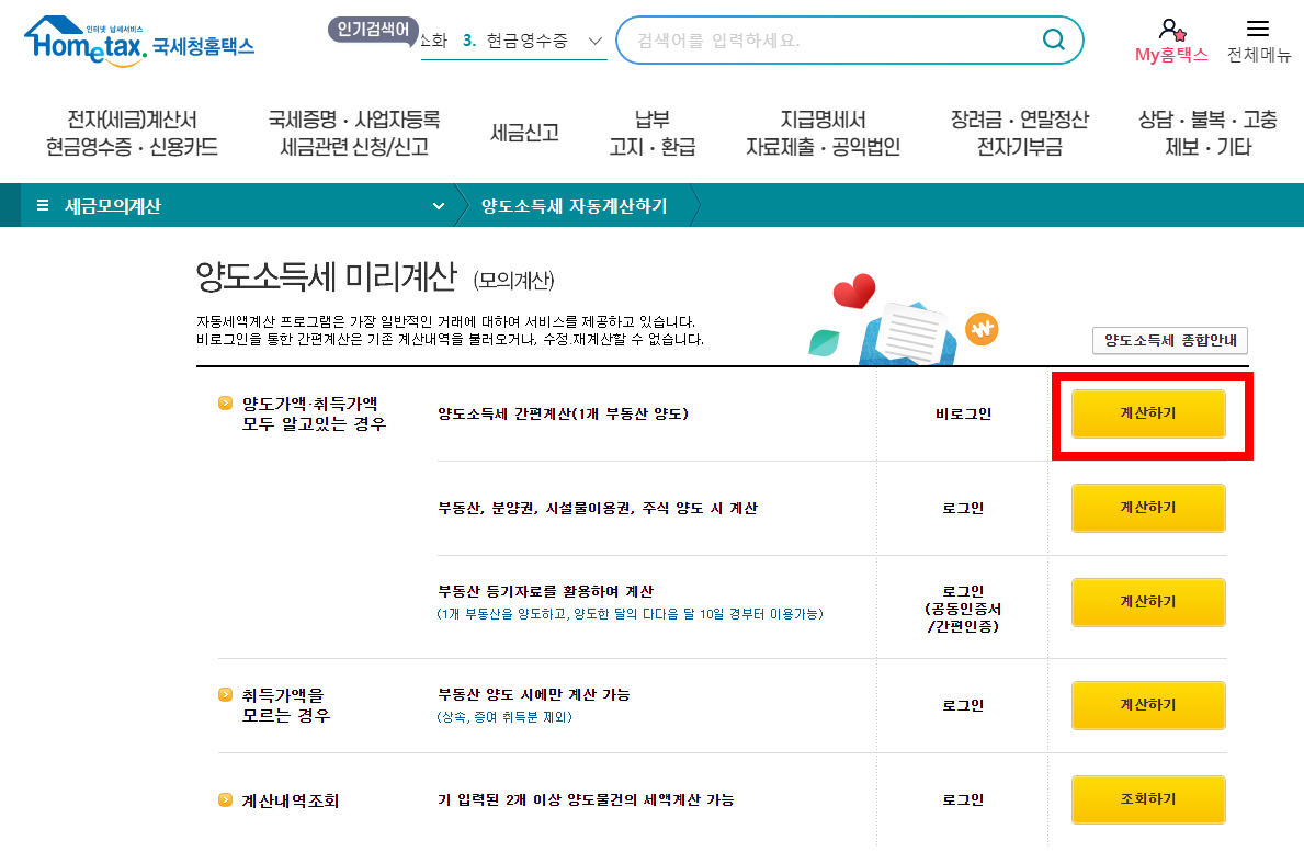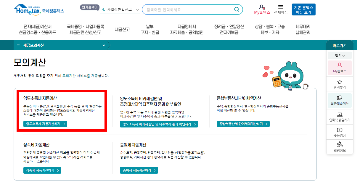 양도소득세 자동계산하기를 클릭합니다.