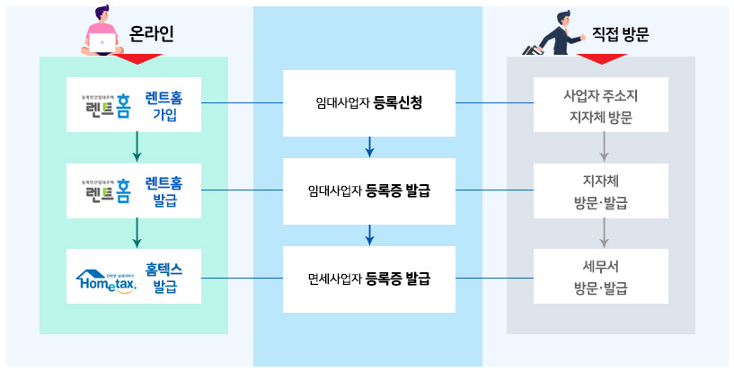 2. 직접방문절차는 사업자주소지 지자체 방문>임대사업자등록신청>임대사업자등록증발급>세무서 방문> 면세사업자등록증 발급